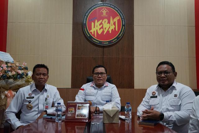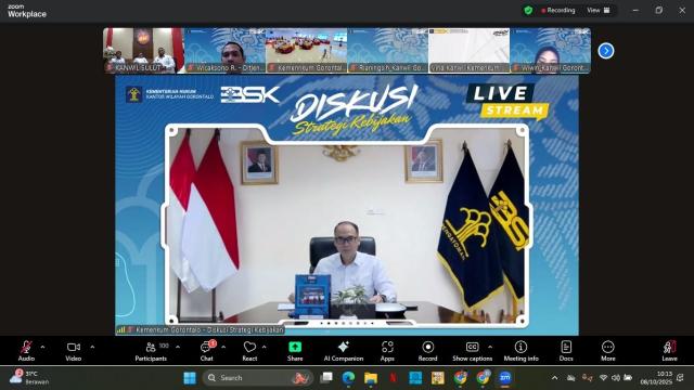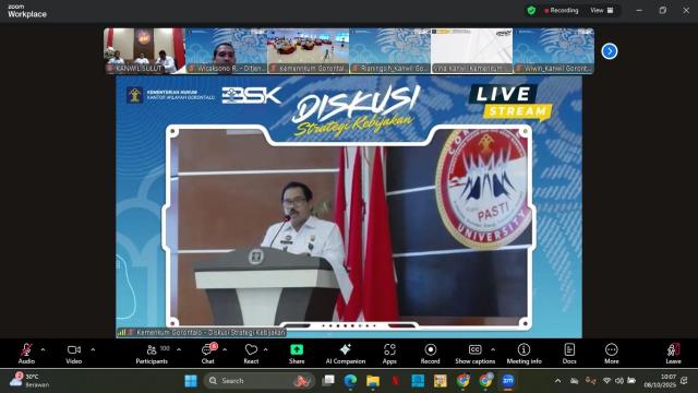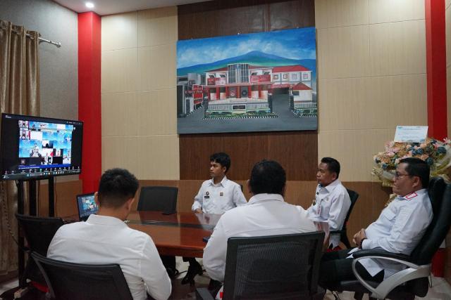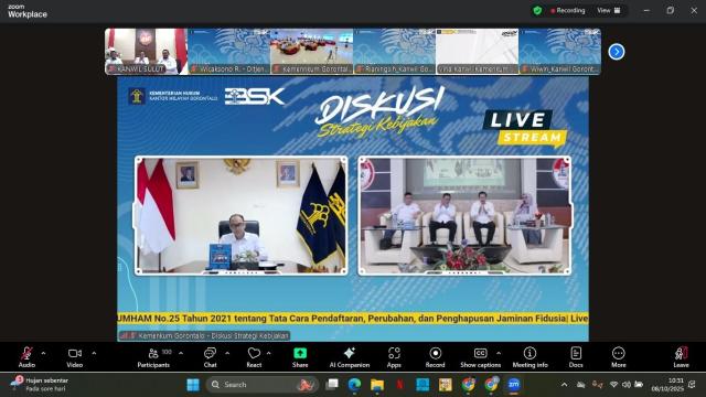 MANADO - Kepala Kantor Wilayah Kementerian Hukum Sulawesi Utara, Kurniaman Telaumbanua bersama para Kepala Divisi mengikuti Diskusi Strategi Kebijakan Kanwil Kemenkum Gorontalo yang mengangkat topik Analisis Implementasi Permenkumham Nomor 25 Tahun 2021 tentang Tata Cara Pendaftaran, Perubahan dan Penghapusan Jaminan Fidusia pada Rabu (8/10).